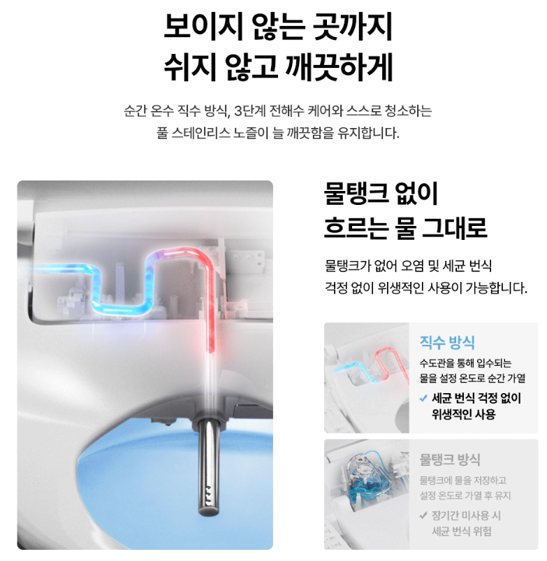 매일 피부에 직접 닿는 비데, 단순히 물만 잘 나온다고 다가 아닙니다. 습기가 많은 화장실 환경 특성상 노즐의 청결 상태와 기기 자체의 방수 등급은 제품 수명과 우리 가족의 건강을 결정짓는 가장 중요한 요소입니다.