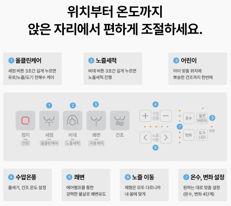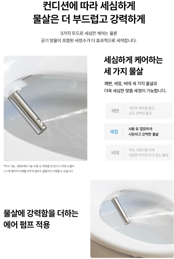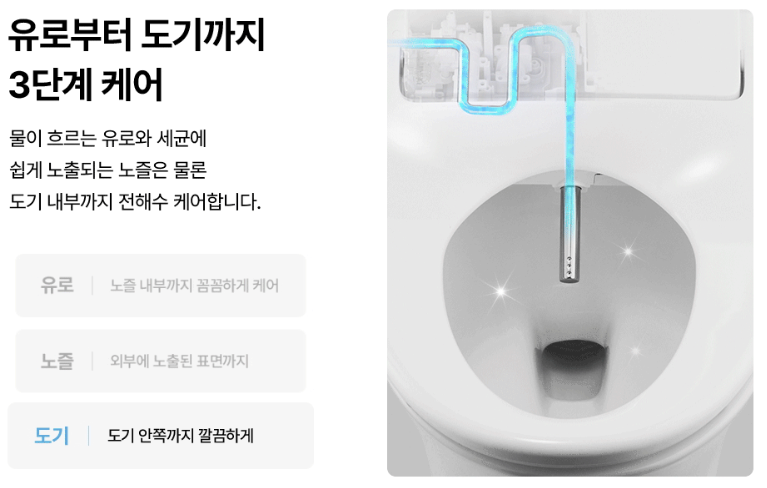 | 특이 사항 | 2단계 자가 관리 모드 | 도기 안쪽 버블 살균 강화 |