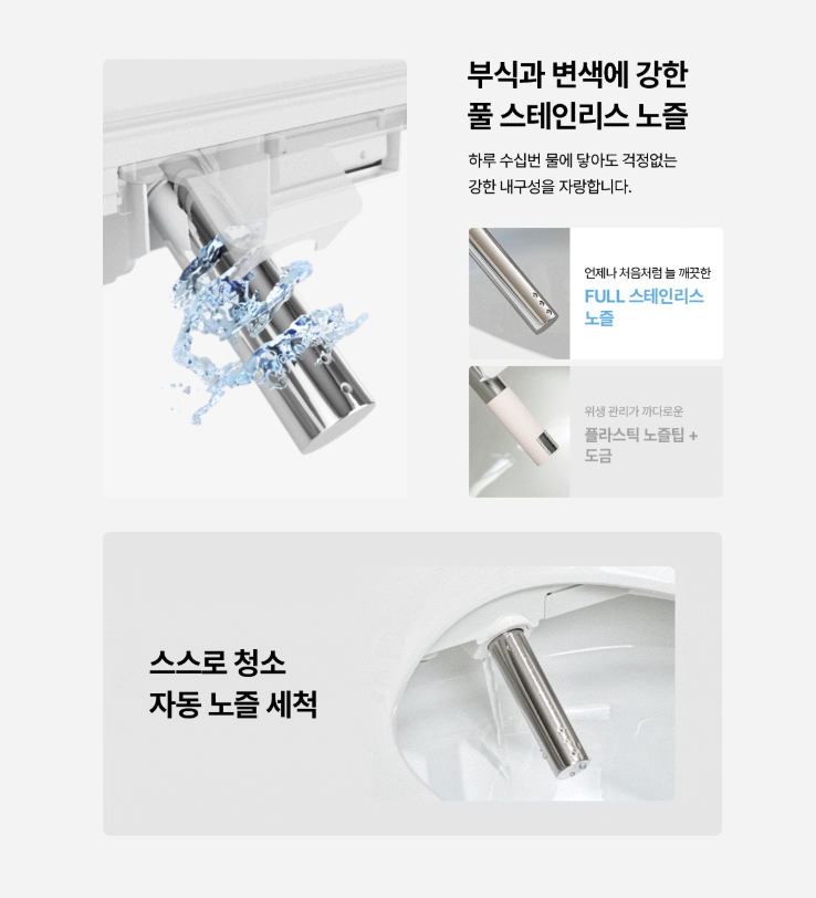 플라스틱 노즐은 시간이 지나면 오염되거나 변색되기 쉽습니다. 오염에 강한 풀 스테인리스 노즐을 채택하여 이물질이 잘 달라붙지 않으며, 반영구적으로 위생적인 사용이 가능합니다.
